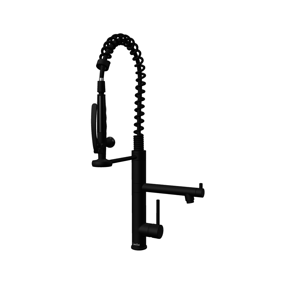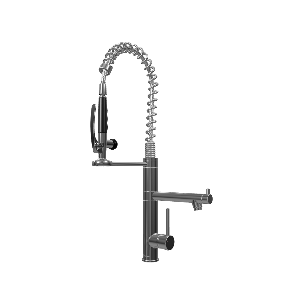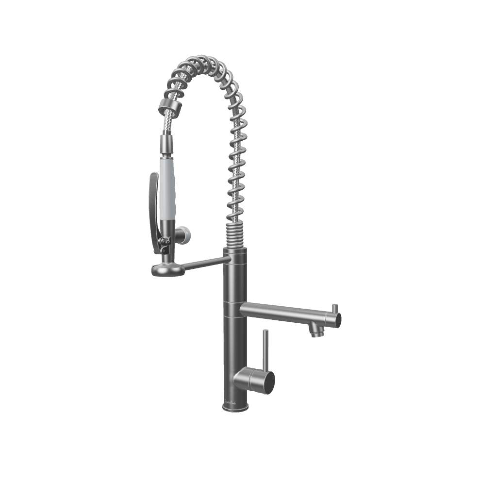 The Klempner is a commercial level spring goose-neck mixer - the ultimate sink mixer for your kitchen. It boasts a highly flexible retractable pull-down nozzle to direct the water flow to where you need it. The classic pencil handle and cushioned feel of the internal ceramic cartridge mixer make it easy to perfectly adjust the water temperature and flow. Its large sturdy nozzle has an ergonomically designed trigger button to higher pressure shower spray for washing vegetables and dishes.